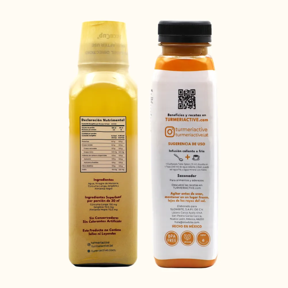 Bebida funcional de Curcumina Activada con Pimienta Negra, Jengibre, Vinagre de Manzana y Agua Purificada. Su fórmula ofrece una potente acción antiinflamatoria que ayuda a equilibrar y proteger tu cuerpo desde el nivel celular. - Producto #2: Concentrado Líquido de Curcumina Activada